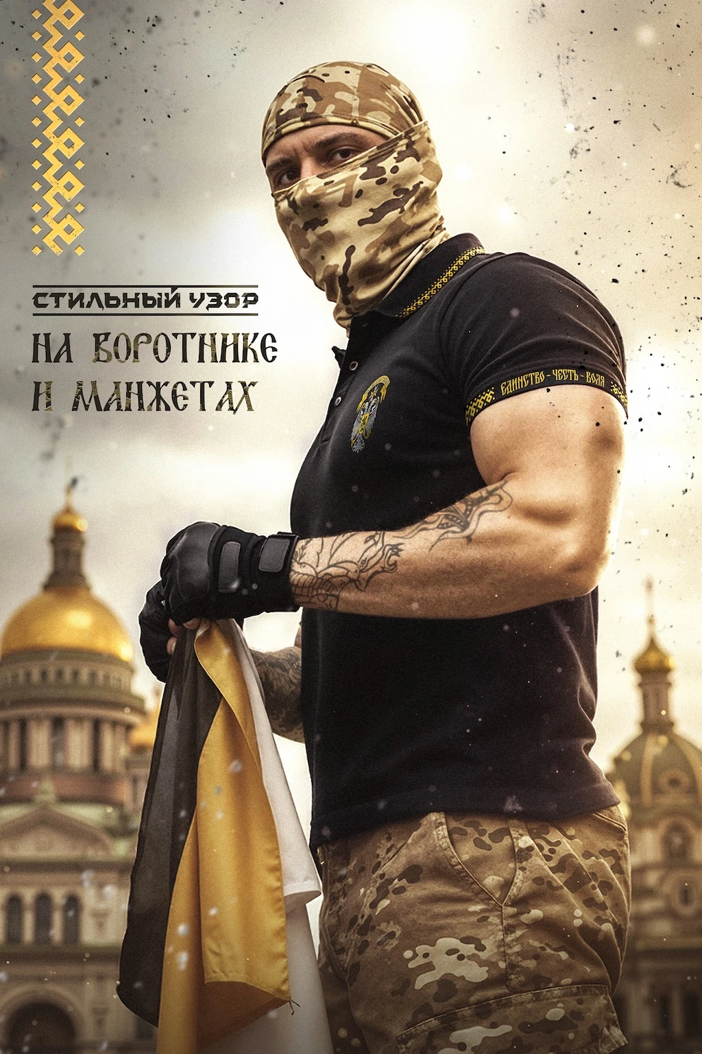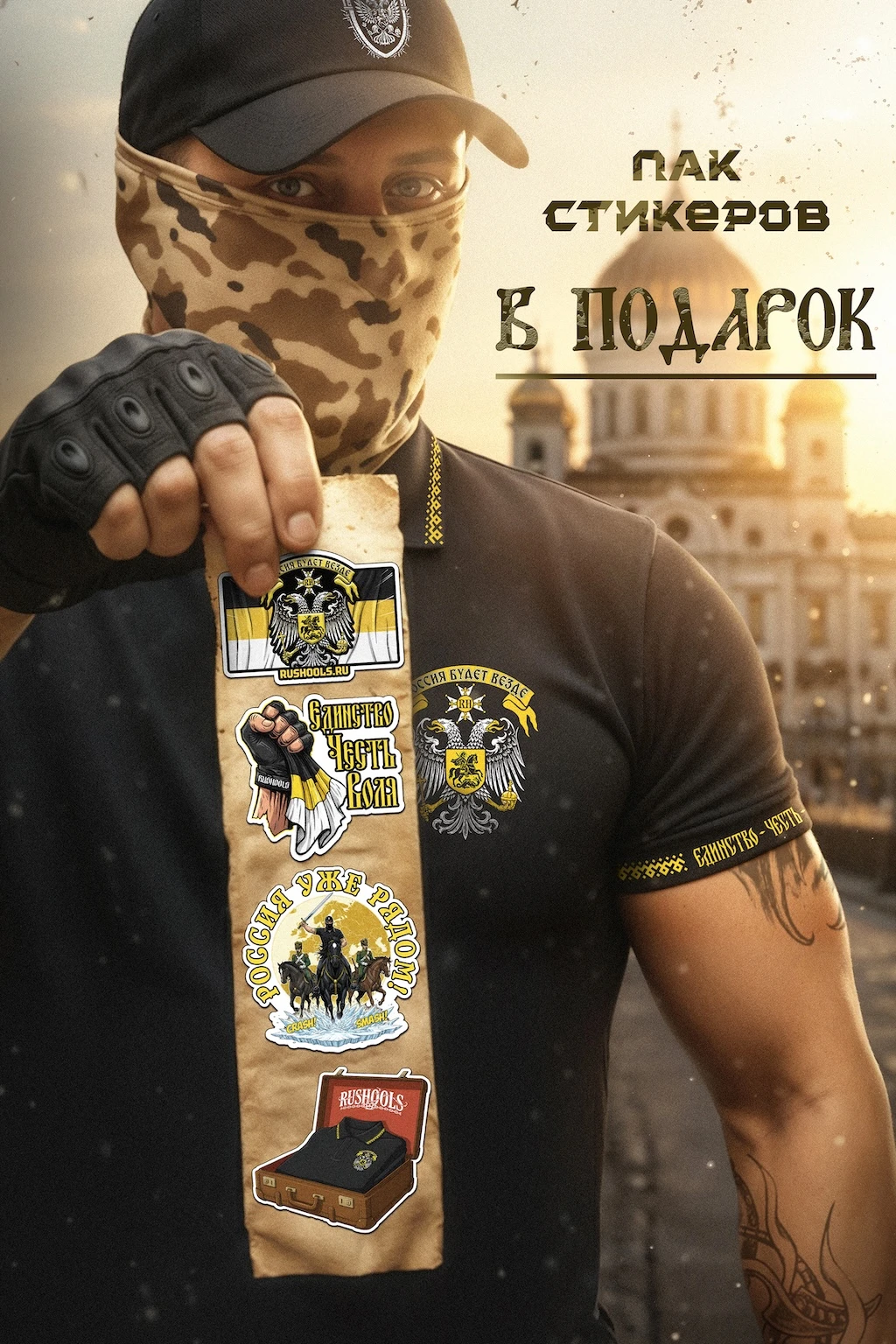 На груди расположен детализированный принт двуглавого орла с девизом «РОССИЯ БУДЕТ ВЕЗДЕ», выполненный методом шелкографии — стойкий, чёткий и долговечный. Манжеты украшены надписью «ЕДИНСТВО — ЧЕСТЬ — ВОЛЯ» — символами принципов и внутреннего стержня.